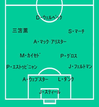 シーズン前半と後半で様々な要因(監督が変わったり、けが人が出たり、レギュラー奪取があったり、監督との確執からの移籍があったり、、)からメンバー構成が結構変わっておりますが、カイセド、ダンクはほぼ固定でアリスター、グロスはポジション変わりつつも出ずっぱりでこの4人とシーズン途中からは三苫もほぼ不動のレギュラーになります。