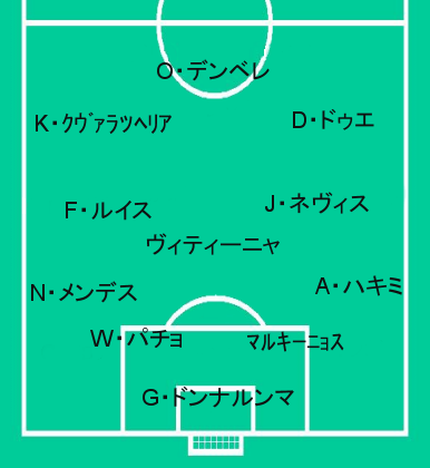 センターフォワードはバロンドーラーになるデンベレですが、ゴンサロ・ラモスが控え。